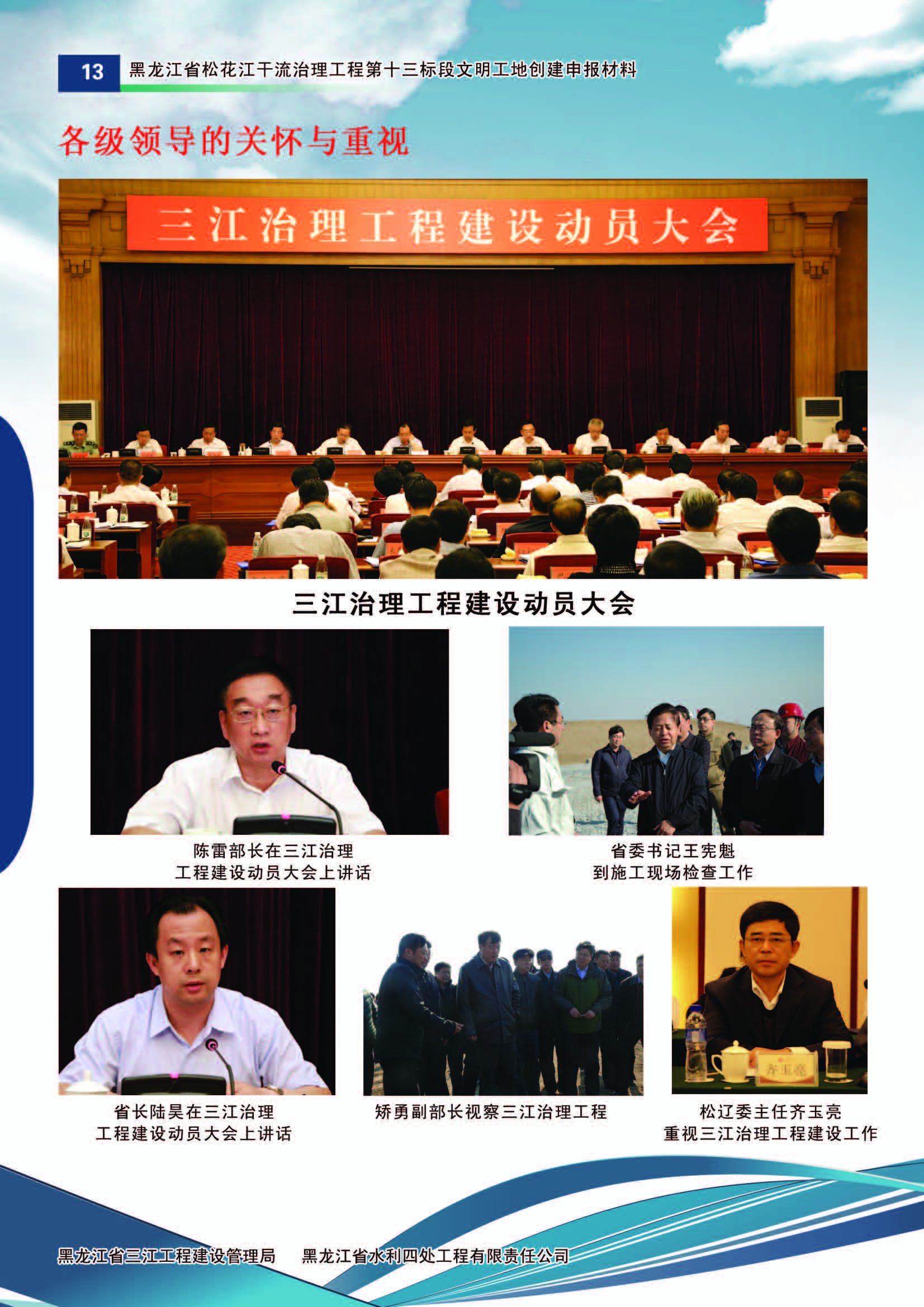 黑龍江省委、省政府高度重視三江干流治理工程建設(shè),成立了以省委主要領(lǐng)導(dǎo)為組長(zhǎng)的三江治理工程建設(shè)領(lǐng)導(dǎo)小組,多次召開專題會(huì)議部署建設(shè)工作。按照省委、省政府的統(tǒng)一部署,黑龍江省水利廳組建了黑龍江省三江工程建設(shè)管理局為項(xiàng)目法人單位,委派松花江工程建設(shè)管理處具體負(fù)責(zé)松花江干流治理工程的建設(shè)與管理。
