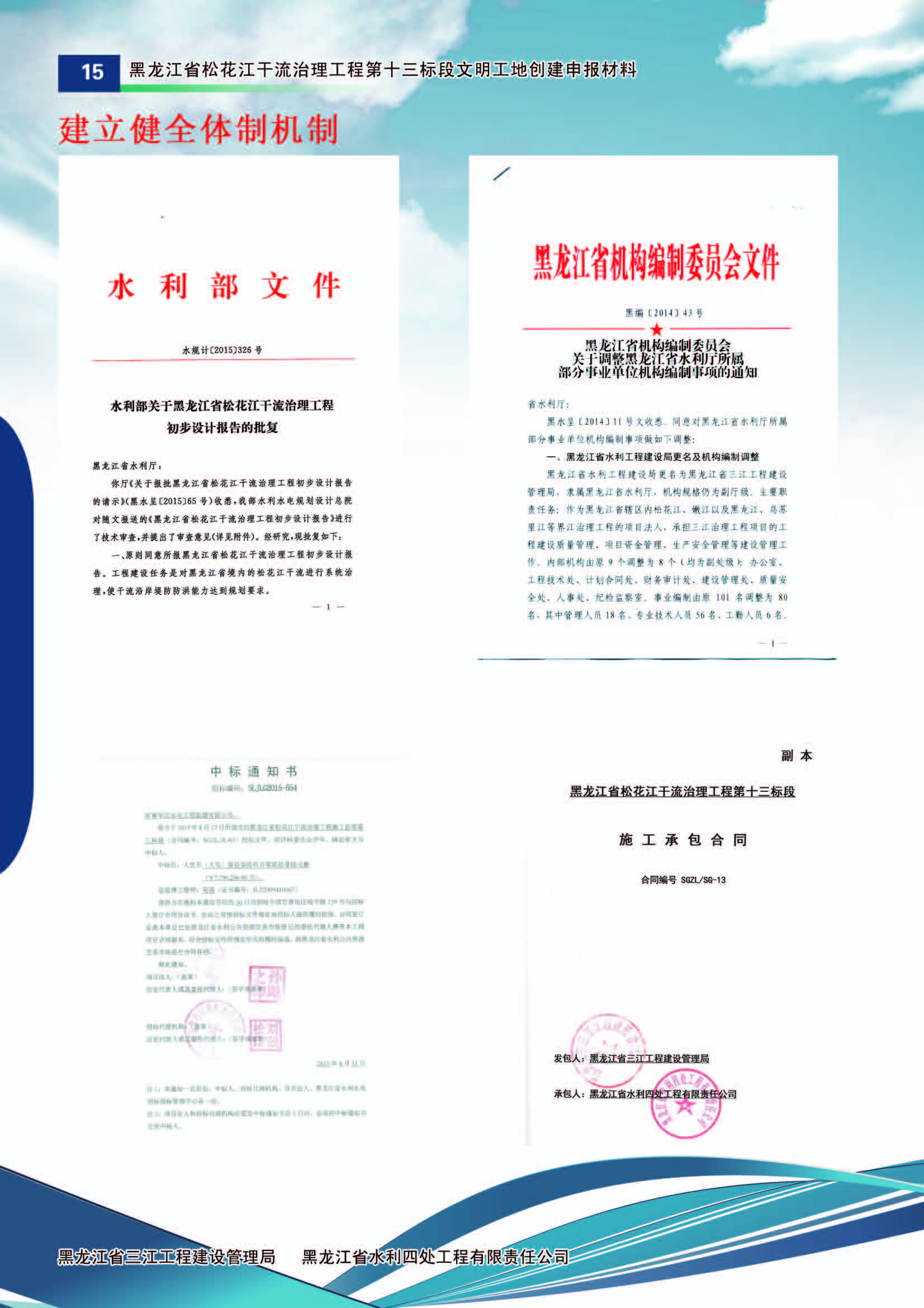 2015年8月22日,經(jīng)過公開評(píng)標(biāo),松花江干流治理工程第十三標(biāo)段確定施工中標(biāo)單位為黑龍江省水利四處工程有限責(zé)任公司,合同金額為1.23億元,合同工期489日歷天。