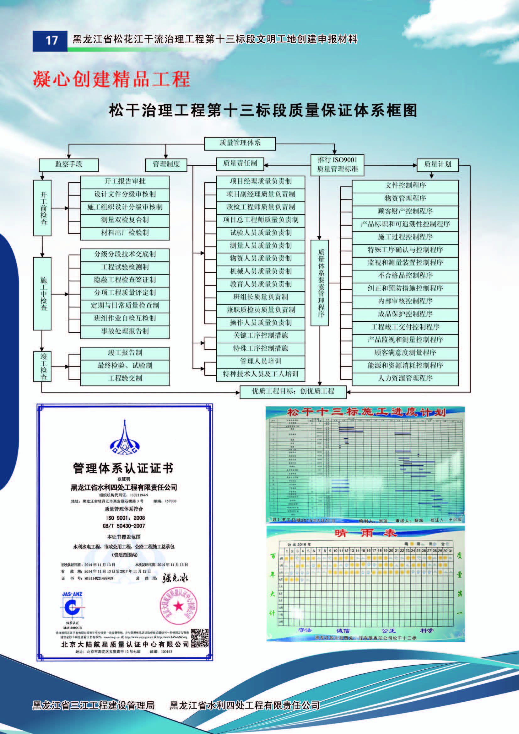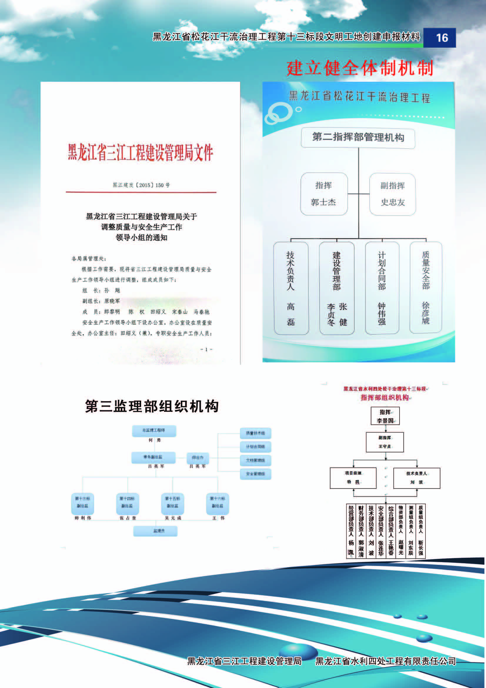 松花江處整章建制,規(guī)范運(yùn)作,健全組織機(jī)構(gòu),制定并實(shí)施了工程質(zhì)量創(chuàng)優(yōu)質(zhì)、安全生產(chǎn)零事故、文明工地建設(shè)創(chuàng)優(yōu)的總體爭(zhēng)創(chuàng)工作目標(biāo),制定多項(xiàng)實(shí)施方案。松花江處根據(jù)工程跨地域建設(shè)特點(diǎn),全線設(shè)置了四個(gè)工程指揮部,八個(gè)監(jiān)理部的工程指揮管理模式。施工單位成立了工程項(xiàng)目部,從而建立健全了松干治理工程的組織體系和保證體系,機(jī)構(gòu)職能得到有效發(fā)揮。
